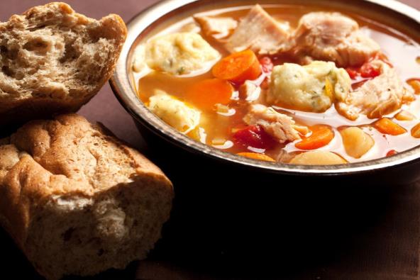 Za knedle u činiju dodajte brašno, prašak za pecivo, mirođiju, so i peršun. Umešajte rastopljeni puter i mleko, i mešajte dok se sve ne sjedini. Ubacujte knedle kašiku po kašilu u čorbu. Kuvajte 15 minuta i uživajte! Ukoliko ste ljubitelji čorbe, možda ćete želeti da napravite i pileću čorbu sa četiri vrste povrća i začinskim biljem.