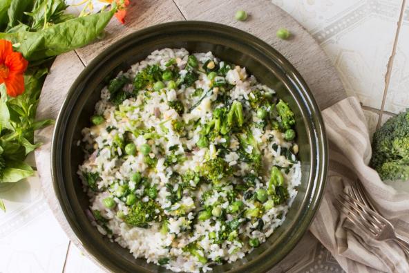 Dodajte bujon u pirinač, dok ne postane kremast, a zatim dodajte sve povrće, uključujući blanširani brokoli, i dinstajte 1 minut. Umešajte preostali puter, sir, začinsko bilje i limunovu koricu, začinite i stavite poklopac. Ostavite da odstoji 3 minuta, a zatim servirajte u toplim činijama sa dodatnim sirom, ako želite. Možda ćete želeti da napravite i rižoto sa slaninom, jajima i sirom.