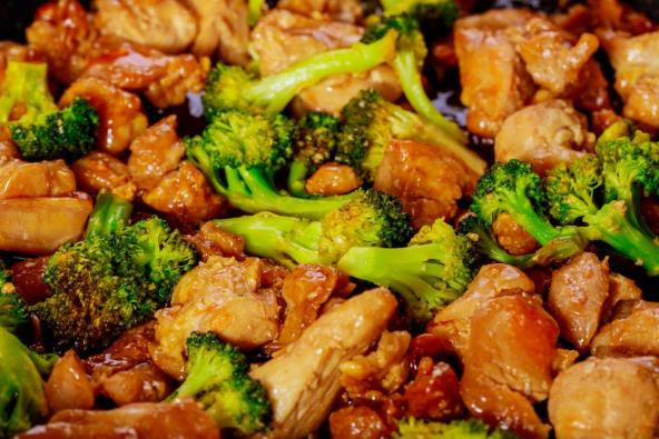Za belo meso sa brokolijem, prvo u posudi mutite bujon, soja sos, beli luk, med, kukuruzni skrob, đumbir i susamovo ulje, dok se kukuruzni skrob ne rastvori. U velikom tiganju na jakoj vatri zagrejte ulje. Pržite piletinu 1 do 2 minuta. Nastavite da pržite povremeno mešajući, dok ne porumeni sa svih strana, još oko 5 minuta. Prebacite na tanjir.