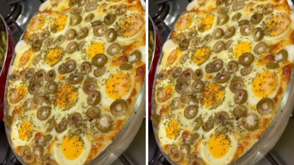 Poređajte po površini iseckane masline i stavite kuvana jaja isečena na kolutove. Pospite na kraju origanom. Pecite u rerni na 180 stpeni oko pola sata. Izvadite iz rerne i kada se malo prohladi uživajte. Možda ćete želeti da napravite i cušpajz od krompira.
