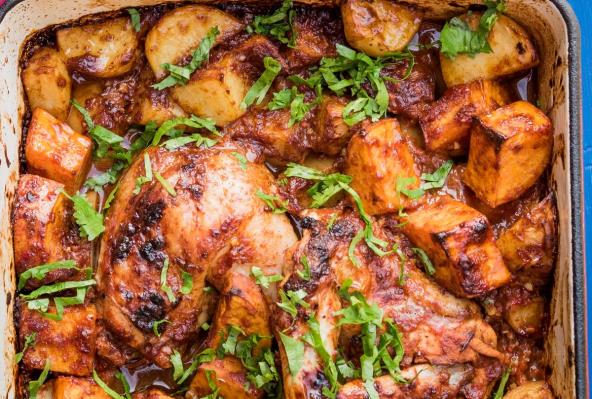 Skinite šerpu sa ringle. U vatrostalnu posudu poređajte batake i krilca, sa kožicom okrenutom na gore. Nakon toga sipajte povrće tako da ga ravnomerno rasporedite oko mesa. U posebnoj činiji pomešajte paradajz sos, vodu, slatku mlevenu papriku, so, biber i mešavinu suvih začina, pa prelijte preko povrća i mesa.