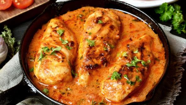 Vratite piletinu i sve nakupljene sokove u tiganj. Prelijte sosom. Prebacite u rernu i pecite, okrećući piletinu na pola pečenja, 10 do 12 minuta. Izmrvite sir preko svega. Iscedite sok od limete i prelijte piletinu, a na vrh stavite peršun i pospite tucanom paprikom. Možda ćete želeti da napravite i pileće ćufte sa njokama.