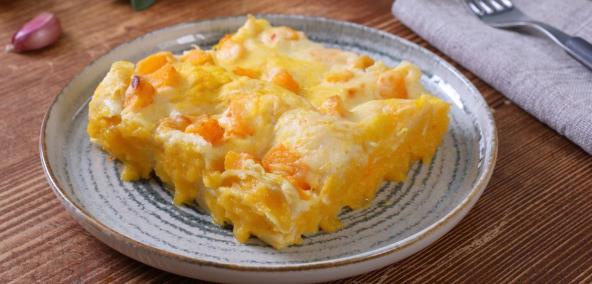 Urolajte svaku jufku i prebacite u pripremljenu posudu za pečenje šavom nadole. Ponovite sa preostalim trakama i mešavinom sira. Kašikom prelijte preostali sos preko lazanje i pospite preostalim belim sirom i kačkavaljem, i sa nekoliko kockica bundeve.