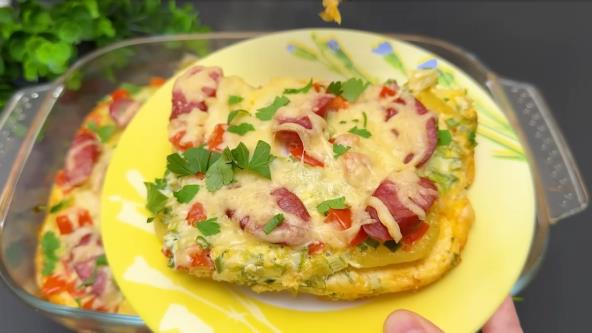 Umutite jaja sa pavlakom pa dodajte seckan čeri i praziluk. Pomešajte pa ubacite i seckane kobasice i začine. Prelijte preko krompira pa pospite rendanim kačkavaljem. Stavite u rernu na 180°C 15-20 minuta.