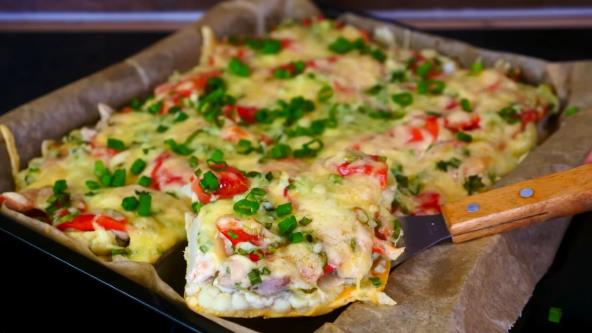 Karfiol isecite na kriške, kratko obarite pa poređajte po dnu pleha za pečenje i nauljite. Prelijte umućenim jajima koja ste posolili i pobiberili. Piletinu isecite na trakice i začinite. Stavite belo meso u posudu, pa dodajte majonez i seckan spanać. Sve dobro sjedinite rukama, pa poređajte preko karfiola. Preko poređajte iseckani paradajz, kao i mladi luk, pa onda sve pospite rendanim sirom.