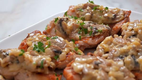 Pileće filete začinite solju, biberom i belim lukom sa obe strane. Pečurke očistite i iseckajte. Crni luk iseckajte pa propržite na ulju, zatim izvadite iz tiganja, pa ubacite pečurke. Kada su pečurke pržene vratite crni luk, sipajte pavlaku i sve zajedno ukrčkajte. Prebacite u činiju pa pomešajte sa rendanim sirom.