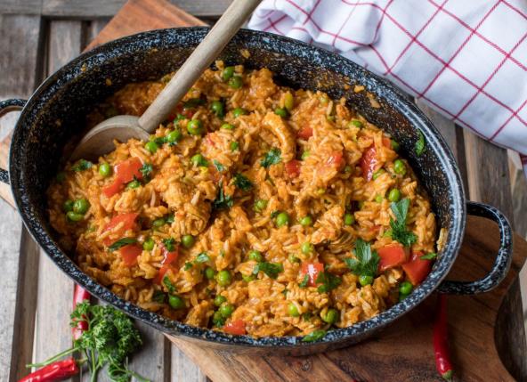 Iseckajte meso na kockice. U tiganju zagrejte ulje i propržite meso dok ne porumeni sa svih strana. Izvadite meso i ostavite sa strane. U istom tiganju na preostalom ulju propržite crni luk dok ne omekša. Dodajte beli luk, šargarepu, paprike i krompir. Dinstajte 5-7 minuta.Dodajte opran pirinač u tiganj s povrćem i kratko propržite. Vratite meso u tiganj i promešajte. Dodajte iseckan paradajz (ili pasirani paradajz), grašak, lovorov list i začine. Sipajte supu ili vodu da sve prekrije.