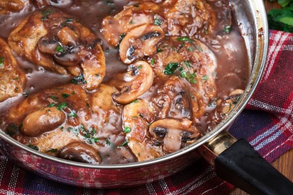 Poslužite šnicle sa sosom od šampinjona preko, ukrašene svežim peršunom.