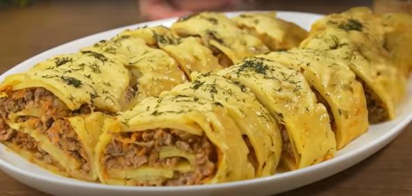 Na vrh krompira ravnomerno rasporedite pripremljeno mleveno meso. Odozgo pospite malo rendanog sira. Sve umotajte u rolnu pomoću papira za pečenje. Po vrhu rolata pospite preostali rendani sir.