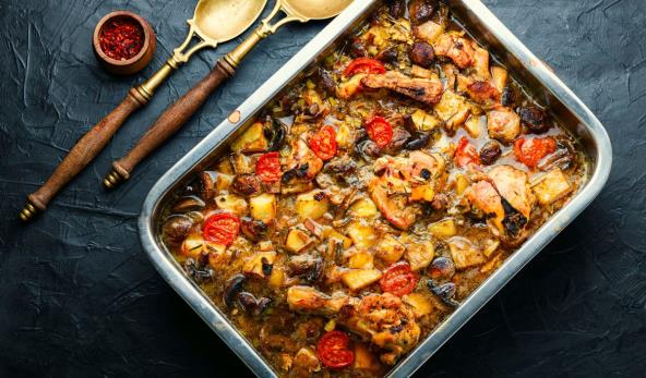 Nakon toga ubacite i iseckani crni luk, papriku, paradajz i beli luk. Sipajte paradajz vodu i paradajz sos i ostavite da se krčka. Smesu prebacite u vatrostalnu posudu, dodajte piletinu i odozgo pospite rendanim kačkavaljem. Pecite oko deset minuta u rerni na 200 stepeni. Servirajte i uživajte! Možda ćete želeti da napravite i domaće pljeskavice od krompira i piletine.