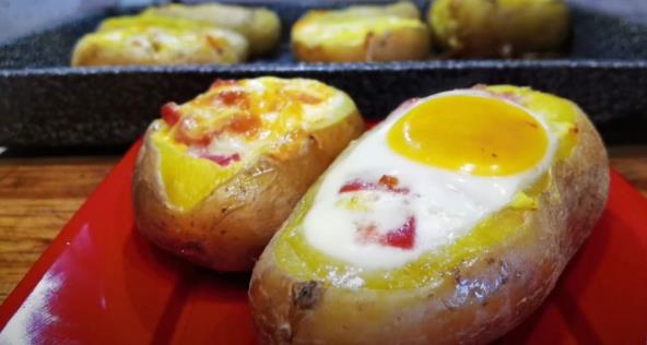 Isečeni krompir posolite po ukusu i napunite sirom, seckanim kiselim krastavcima, kukuruzom, šunkom i belim sirom. Po želji dodajte i jaje.