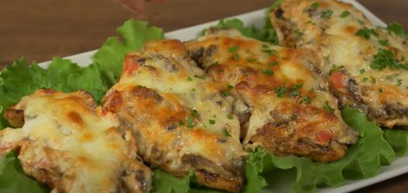 Marinirani pileći file stavite na dobro zagrejan tiganj i ispržite na jakoj vatri. Stavite pripremljeni file u posudu za pečenje. Na svaki komad mesa stavite fil od povrća. Narendajte sir na krupno rende i svaki file odozgo pospite rendanim sirom.