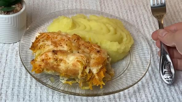 U manjoj činiji pomešajte maslinovo ulje, soja sos i senf. Premažite preko fileta. Dodajte narendanu šargarepu i crni luk preko. Pospite narendanim kačkavaljem. Pecite u prethodno zagrejanoj rerni na 180°C oko 30 minuta, dok se sir lepo ne otopi i blago zapeče.