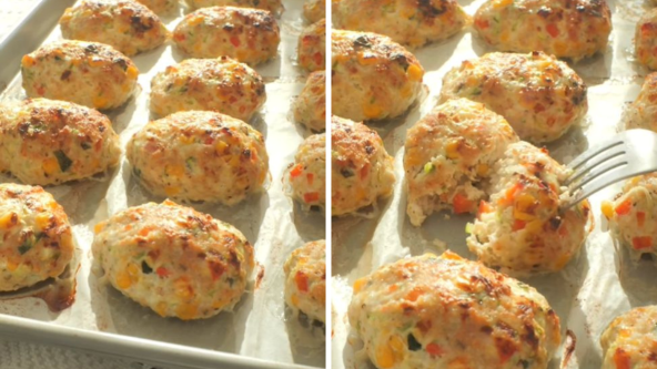Kako biste napravili ove ćufte, pomešajte mlevenu piletinu sa prezlama, jajetom, solju, biberom, bosiljkom, seckanom paprikom, spanaćem isečenim na trakice, tikvicama isečenim na trakice i kukuruzom i belim lukom.
