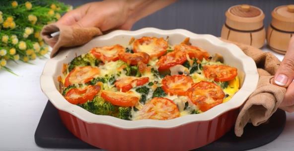 U pripremljenu vatrostalnu posudu stavite brokoli i pečurke. Sve prelijte pripremljenim sosom od jaja. Stavite kriške paradajza odozgo i pospite rendanim sirom. Stavite u rernu zagrejanu na 180 stepeni. Pecite 40 minuta. Uživajte! Možda ćete želeti da napravite i musaku sa brokolijem i mlevenim mesom.