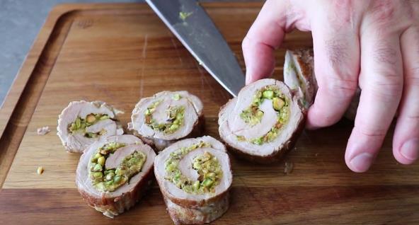 Kako biste napravili svinjski file, prvo stavite svinjetinu na dasku za sečenje i očistite ga. Isecite meso tako što ćete seći po dužini, ali nemojte da ga isečete do kraja. Stavite meso na komad najlonske folije i prekrijte drugim komadom folije. Izlupajte ga čekićem za meso. Pokrijte i stavite u frižider dok pripremate ostalo. Pistaće krupno iseckajte i ostavite sa strane.