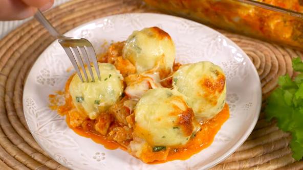 U vatrostalnu posudu rasporediti tanak sloj pirea od krompira. Preko sipati ceo nadev od piletine. Poređati krompir knedle preko nadeva. Pospite narendanim sirom i stavite u rernu. Peći na 180°C oko 15-20 min, dok se sir ne otopi i blago porumeni.