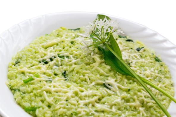Kako biste napravili ovaj rižoto, prvo ubacite sav sremuš (odvojite 1 list) i spanać u blender i umutite sa 100 g bujona, dok ne dobijete glatku, svetlo zelenu tečnost. Ostatak bujona stavite u šerpu i lagano zagrejte. U drugoj šerpi zagrejte maslinovo ulje, pa dodajte crni luk i beli luk i prstohvat soli.