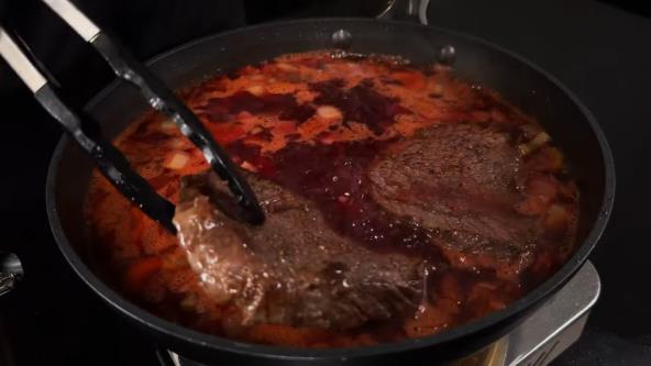 Vratite meso u šerpu, dodajte ruzmarin i prelijte crvenim vinom. Smanjite vatru, poklopite i dinstajte na laganoj vatri 2,5 do 3 sata dok meso ne omekša. Povremeno promešajte i po potrebi dolijte malo vode.