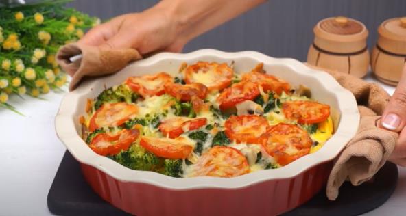 U posudu za pečenje ubacite brokoli i pečurke. Sve prelijte pripremljenim sosom od jaja. Stavite kriške paradajza i pospite rendanim sirom. Stavite u rernu zagrejanu na 180 stepeni, pa pecite 40 minuta. Možda ćete želeti da napravite i posnu salatu sa brokolijem i bademima kao iz restorana.