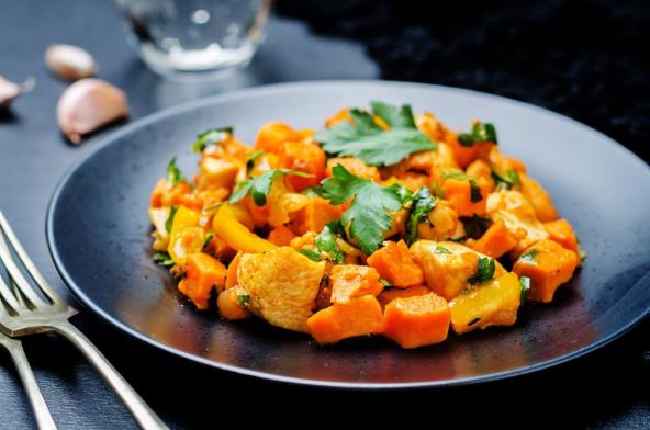 Pržite oko 7-10 minuta i dobro promešajte. Ostavite piletinu na stranu. U isti tiganj dodajte batat i pileći bujon. Poklopite posudu i kuvajte oko 7-10 minuta ili dok se batat ne bude kuvan.