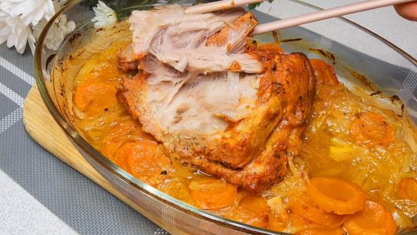 U pleh rasporedite luk i šargarepu, pospite sa malo ulja, posolite i pobiberite. Na povrće položite marinirani vrat. Prekrijte meso papirom za pečenje koji ste prethodno nakvasili vodom, pa preko toga stavi aluminijumsku foliju.