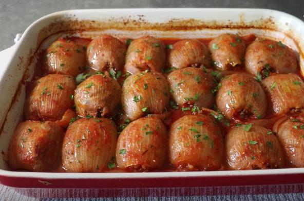 Dodajte oko 2 zaobljene kašike fila na svaki deo luka i uvijte lukom, da pokrije fil. Stavite punjeni luk u posudu za pečenje i prelijte paradajz čorbom preko luka. Pokrijte folijom i stavite na pleh. Pecite u zagrejanoj rerni 1 sat. Skinite foliju i nastavite da pečete, nepokriveno, dok luk ne omekša, a fil potpuno ne bude pečen, još oko 1 sat. Ostavite da odstoji 10 minuta pre serviranja. Uživajte! Možda ćete želeti da napravite i pikantni luk pečen u foliji.