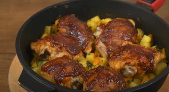Sipajte malo ulja u dobro zagrejan tiganj i stavite komad putera. Stavite karabatake i pržite ih na jakoj vatri dok ne porumene sa obe strane. Izvadite prženo meso iz tiganja. Odmah stavite luk u ovaj tiganj i propržite dok ne porumeni. Dodajte seckanu šargarepu i pržite još 2 minuta. Zatim stavite krompir, promešajte i pržite oko 5-7 minuta. U drugom tiganju pripremite slatko-kiseli sos. Sipajte u tiganj paradajz sos, soja sos, dodajte šećer, senf i kašiku jabukovog sirćeta.