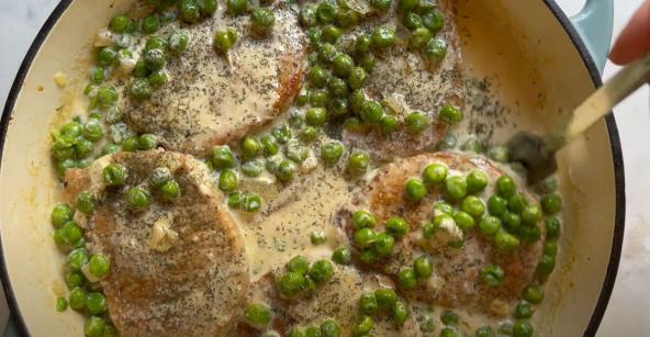 Umešajte grašak i pržite oko 2 minuta. Sipajte pavlaku, smanjite vatru na nisku i krčkajte 2-3 minuta dok se blago ne zgusne. Vratite krmenadle u tiganj sa kremastim graškom. Ostavite sve da se lagano krčka još 5–7 minuta da se ukusi sjedine i da se svinjetina potpuno skuva. Umešajte mirođiju u poslednjem minutu. Servirajte i uživajte. Možda ćete želeti da napravite i sotirane krmenadle sa jabukama