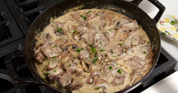 U isti tiganj ubacite beli luk i pečurke, pa kratko propržite dok pečurke ne omekšaju. Vratite meso u tiganj, sipajte pavlaku, dodajte parmezan, timijan, so i biber. Kuvajte dok se sos ne zgusne i meso ne omekša. Po želji pospite seckanim peršunom i poslužite toplo.