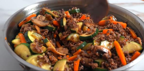 Iseckajte tikvice, šargarepu i šampinjone na sitnije komade. U šerpi ili dubljem tiganju propržite mlevenu govedinu dok ne promeni boju. Dodajte povrće i kratko prodinstajte.