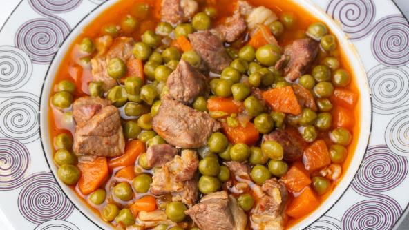 Kada meso malo porumeni, ubacite sitno seckan krompir, šargarepu i beli luk. Promešajte, pa dodajte grašak i kratko prokuvajte.
