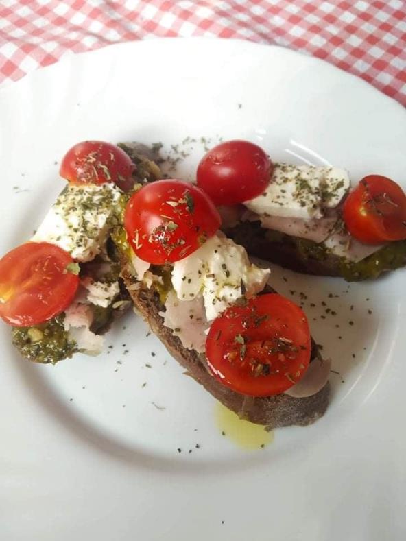 Baget isecite nakoso. Svako parče poprskajte maslinovim uljem pa namažite pesto sosom. Preko stavite šunku, fetu i čeri paradajz. pospite origanom i još malo maslinovim uljem. Poređajte parčiće na pleh koji ste obložili pek papirom i zapecite 10 minuta u rerni na 200 stepeni.