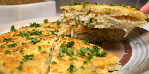 Krompir isecite na tanke kriške (koristite ljuštilicu), a zatim ga potopite u hladnu vodu na nekoliko minuta. Peršun iseckajte pa ga pomešajte sa jajima. Dodajte ostale začine i dobro umutite. Krompir ocedite pa pomešajte sa smesom jaja i začina. U tiganju zagrejte ulje pa stavite sloj pripremljene smese krompira i jaja. Preko toga stavite listiće kačkavalja pa prekrijte novim slojem smese. Tiganj poklopite i pržite na srednje jakoj vatri 10 minuta. Zatim preokrenite smesu i na drugoj strani pecite dodatnih 10 minuta.