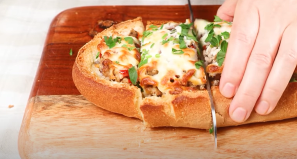 Na ulju propržite seckan crni luk i mleveno meso. Začinite pa dodajte paprike, šampinjone, sve sečeno na sitno. Kada je fil gotov sipajte sve u jednu polovinu vekne.
