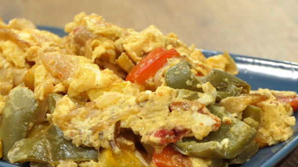 Papriku i crni luk isecite na veće komade, pa propržite. Poklopite tiganj i dinstajte na tihoj vatri nekih 15 minuta. Na kraju dodajte umućena jaja i propržite. Pospite biberom.
