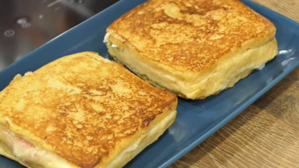 Skinite koricu sa tost hleba, pa jedno parče namažite krem sirom, stavite šunku, pa preko sir. Zatim preko stavite parče hleba, premažite krem sirom, pa stavite šunku i sir. Jednu šnitu namazati krem sirom, staviti parče šunke i sira, na vrh staviti drugu krišku hleba koju smo takođe premazali krem sirom, pa stavite parče šunke i sira. I na kraju stavite treću krišku. Umutite jaja sa mlekom i malo soli. Umočite sendviče u smesu i ispecite u tiganju u kojem ste istopili puter.