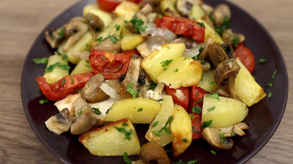Isecite belo meso i poređajte u tepsiju koju ste namastili, pa posolite i pobiberite. Dodajte preko sečen crni luk. U posudi pomešajte pečurke, krompir i paradajz. Prelijte maslinovim uljem, i lepo promešajte. Zatim sipajte preko luka i pecite na 200°C oko 40 minuta. Pospite seckanim peršunom.