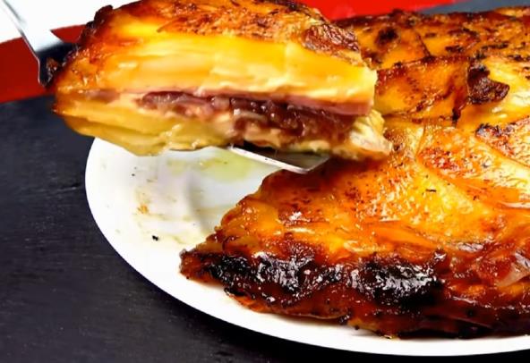 Ideja za večeru nikad dosta pogotovo ako se prave sa krompirom. Između 2 reda omiljenog povrća dodajte sir, šunku i karamelizovani luk i napravićete ukusan obrok koji će se dopasti i najvećim probirljivcima. Krompir je neverovatno sočan, a kada presečete sir koji se razlači ga čini još boljim. Uživajte!