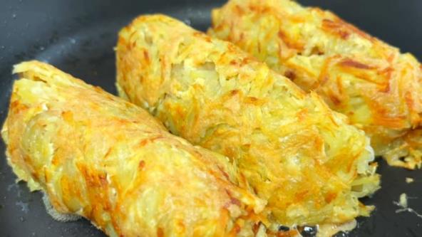 Krompir izrendajte i stavite u posudu, pa prelijte vodom. Zatim da dobro procedite, posolite i promešajte. Jaja umutite i posolite. Viršle presecite na pola, pa ih zasecite na par mesta i ispržite. Zatim u tiganj poređajte krompir da napravite krug (ne morate celo dno da pokrijete). Preko sipajte malo jaja i pržite. Špatulom pritisnite. Stavite proprženu viršlu i urolajte. Ostavite još par minuta da se prži. Tako uradite i sa preostalim sastojcima.
