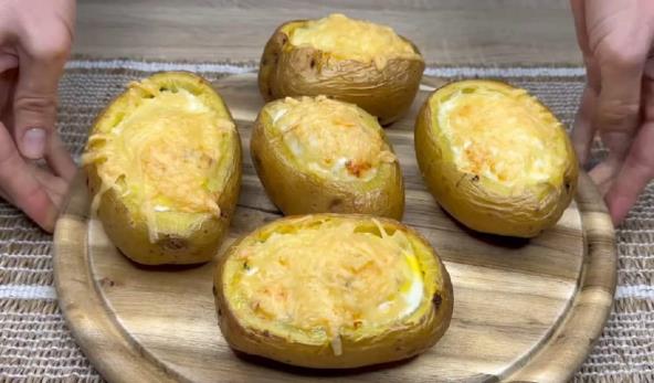 Opran krompir poređajte sa sve ljuskom na pleh obložen aluminijumskom folijom i svaki pojedinačno pospite maslinovim uljem. Prekrijte pleh alu folijom, pa pecite na 200°C oko 35 minuta. Iseckajte crni luk, pa ga propržite oko 3 minuta na manjoj količini ulja. U tiganj ubacite i iseckanu šunku, pa pržite još 3-4 minuta. Dodajte so i biber, pa dobro promešajte. Usitnite peršun, pa ga dodajte u tiganj. Isecite četvrtinu krompira, pa izdubite unutrašnjost koju ćete napuniti smesom od šunke i luka. Dodajte po jedno jaje na vrh svakog krompira i pospite malo bibera i soli. Izrendajte tvrdi sir, pa i njega rasporedite po vrhu. Pecite na 180°C oko 30 minuta.