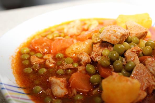 Pržite povrće par minuta, pa prelijte vodom i ubacite kocku supe i paradajz sok. Potom dodajte svemu začine i piletinu. Kuvajte na umerenoj temperaturi. Isprobajte grašak i krompir, kako biste proverili da li je kuvano.
