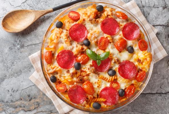 Za ovu pastu skuvajte testeninu al dente. Ocedite pastu i prebacite je vatrostalnu posudu, pa sipajte paradajz sos, paradajz isečen na kockice i feferone iseckane na kolutove. Sve izmešajte pa ubacite iseckani mocarela sir i promešajte, kao i polovinu kobasica.