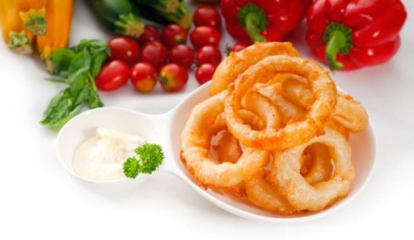 Luk očistite i isecite na kolutove. Posolite, uvaljajte u brašno (višak otresite), jaja i prezle. Pržite u ulju, dok kolutići ne porumene. Odlažite na salvetu da upije masnoću.