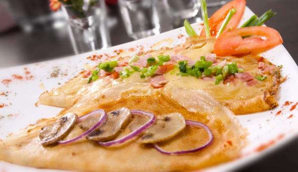 4. Šampinjone očistiti i iseći na krupno. Koktel paradajz iseći na polovine. Crni i beli luk sitno iseckati i ispržiti na preostalom ulju. Dodati iseckane pečurke i pržiti na jakoj vatri. Dodati paradajz i sve zajedno pržiti još dva minuta. Posoliti i pobiberiti po želji, pa rasporediti po palačinkama kao fil. Uviti palačinke i služiti ih dok su tople, kao glavno jelo.
