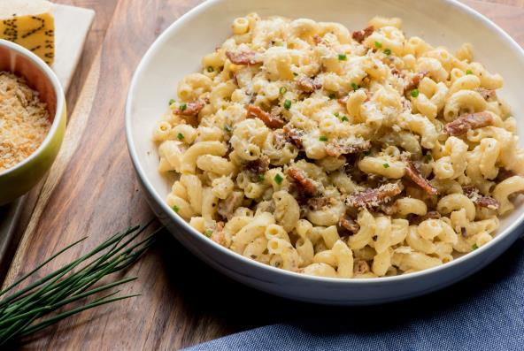 Testeninu skuvajte. Jaja umutite sa pavlakom pa dodajte sitan sir. Posolite ako sir nije slan. Pomešajte sos sa makaronama pa prebacite sve u vatrostalnu posudu. Dodajte slaninicu i zapecite dok ona ne porumeni. zatim narendajte kačkavalj i vratite u rernu na 5 min. Kada se rastopi pospite peršunom i služite.