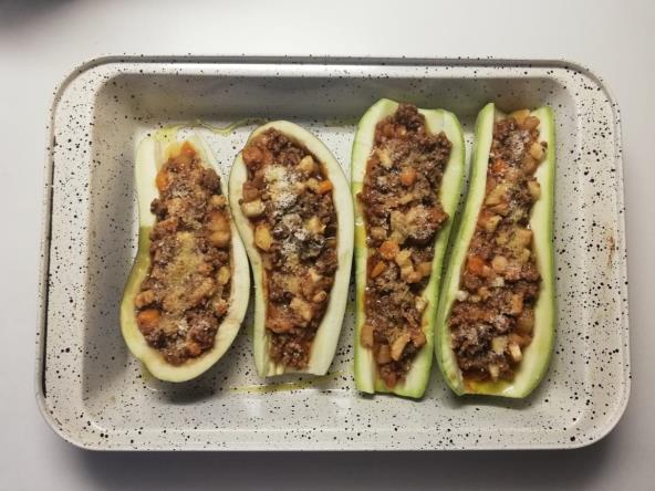 Tikvicu i patlidžan operite pa rasecite na pola po dužine. Unutrašnjost izdubite i naseckajte sitno trebaće vam kasnije. Na maslinovom ulju propržiti sitno seckan luk i šargarepu. Dodati meso i dobro upržiti. Ubaciti iseckanu tikvicu i patlidžan ( ono što ste izdubili), začiniti pa kad se uprži ubaciti paradajz. Rasečene tikvice i patlidžan stavite u pleh koji ste malo nauljili, napunite nadevom i zapecite u rerni na 200 stepeni oko pola sata. Prijatno.