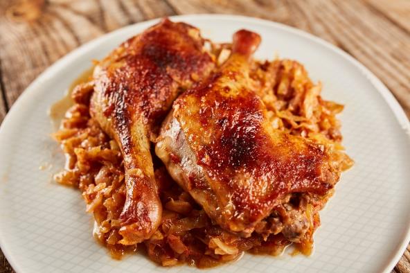 Crni luk propržite na ulju, a zatim dodajte soja sos koji ste pomešali sa šećerom. Kratko krčkajte, pa dodajte batake. Pecite 2-3 minuta na visokoj temperaturi i onda sipajte koka kolu. Krčkajte nekih 35 minuta, a onda servirajte batak i preko sipajte malo karamelizovanog luka.