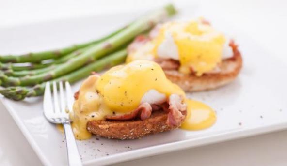 4. Na zagrejane polovine pogačica namažite puter, pa stavite preko slaninu i poširana jaja. Prelijte pripremljenim sosom i dekorišite po želji.