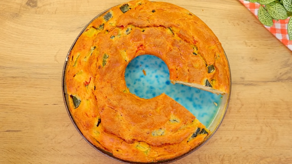 Podmazati kalup za kuglof ili tepsiju. Dobijeno testo pomešati sa prženim povrćem pa izručiti u kalup. Peći 50 minuta na 180 stepeni.